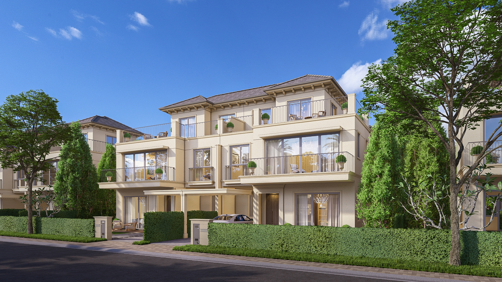 Nhà phố vườn 7–9m: Diện tích 7×19.5m – 8×19.5m – 9×20.5m, xây 3 tầng, mặt tiền rộng, bố trí không gian linh hoạt, phù hợp gia đình trẻ.