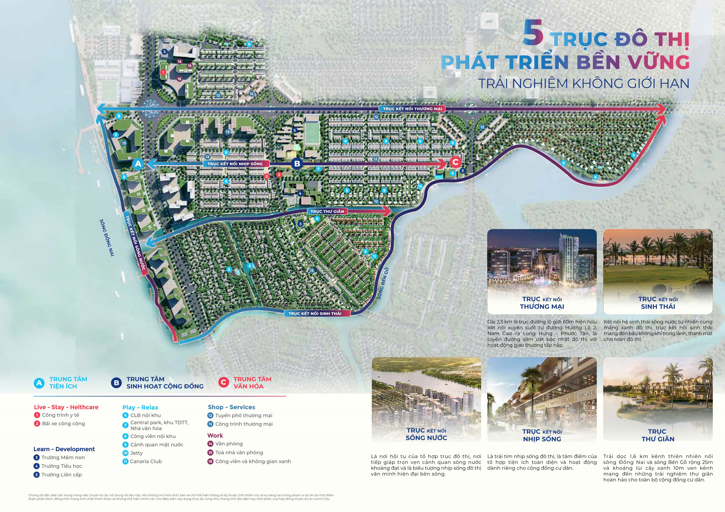 Một trong những điểm nổi bật trong quy hoạch Izumi City là mô hình 5 trục đô thị phát triển bền vững. Hệ thống các trục kết nối giúp hình thành cấu trúc đô thị hiện đại, đồng thời tạo nên không gian sống hài hòa giữa thiên nhiên và nhịp sống năng động bên sông Đồng Nai.