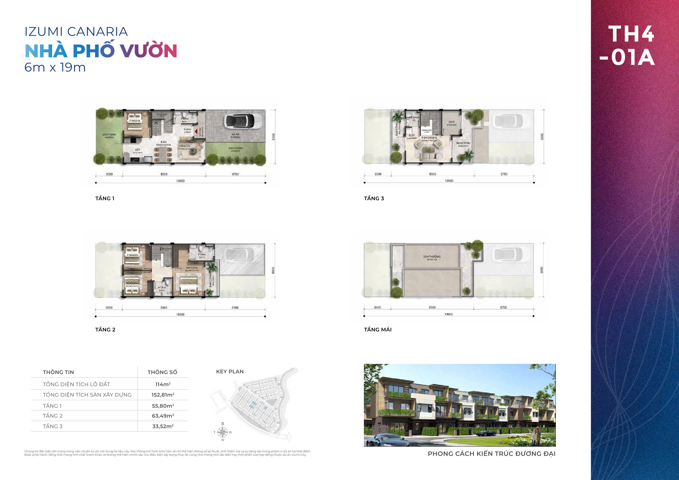 Nhà phố vườn 6m: Diện tích 6x19m (114m²), xây 3 tầng, thiết kế hiện đại với sân trước – vườn sau 35m2 , tối ưu ánh sáng tự nhiên.